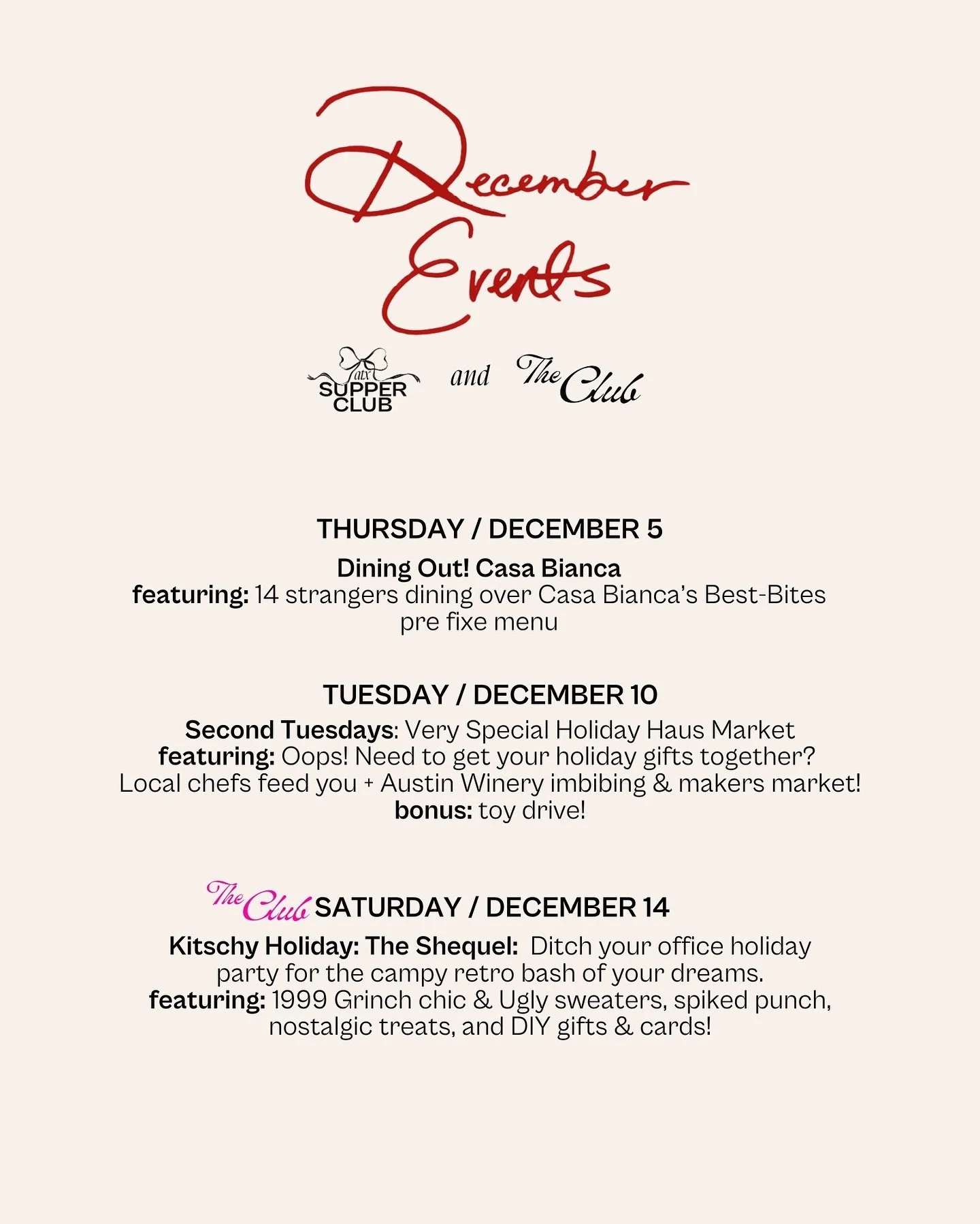 ATX SUPPER CLUB WAS CREATED OUT OF A LOVE FOR COMMUNITY, GREAT FOOD, AND A GOOD BEVVIE! WE CURATE A SAFE, BEAUTIFUL SPACE, MENU, AND VIBE SO THAT YOU CAN CREATE CONNECTIONS THAT LAST, OVER A MEAL TO REMEMBER.
