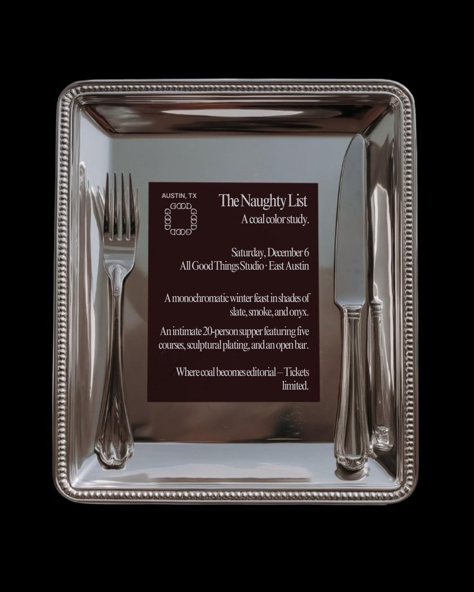 A monochromatic winter supper for the art girlies, the minimalists, and the ones who appreciate a little shadow-play in their holiday season. “The Naughty List” is a five-course, sculptural dinner exploring shades of slate, smoke, and onyx — where coal becomes something editorial, elevated, and entirely delicious.